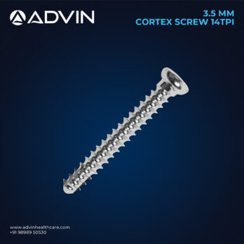 The 3.5mm Cortex Screw (14 TPI) is designed for use in cortical bone fixation, offering strong purchase and stability in trauma and orthopedic procedures. Its 14 TPI threading allows precise engagement with cortical bone, ensuring minimal risk of loosening. This screw is ideal for small to medium bone fractures and is compatible with various plates and reconstruction systems. Advin Health Care manufactures these screws using high-quality stainless steel and titanium, ensuring biocompatibility, strength, and reliable performance in surgical applications.