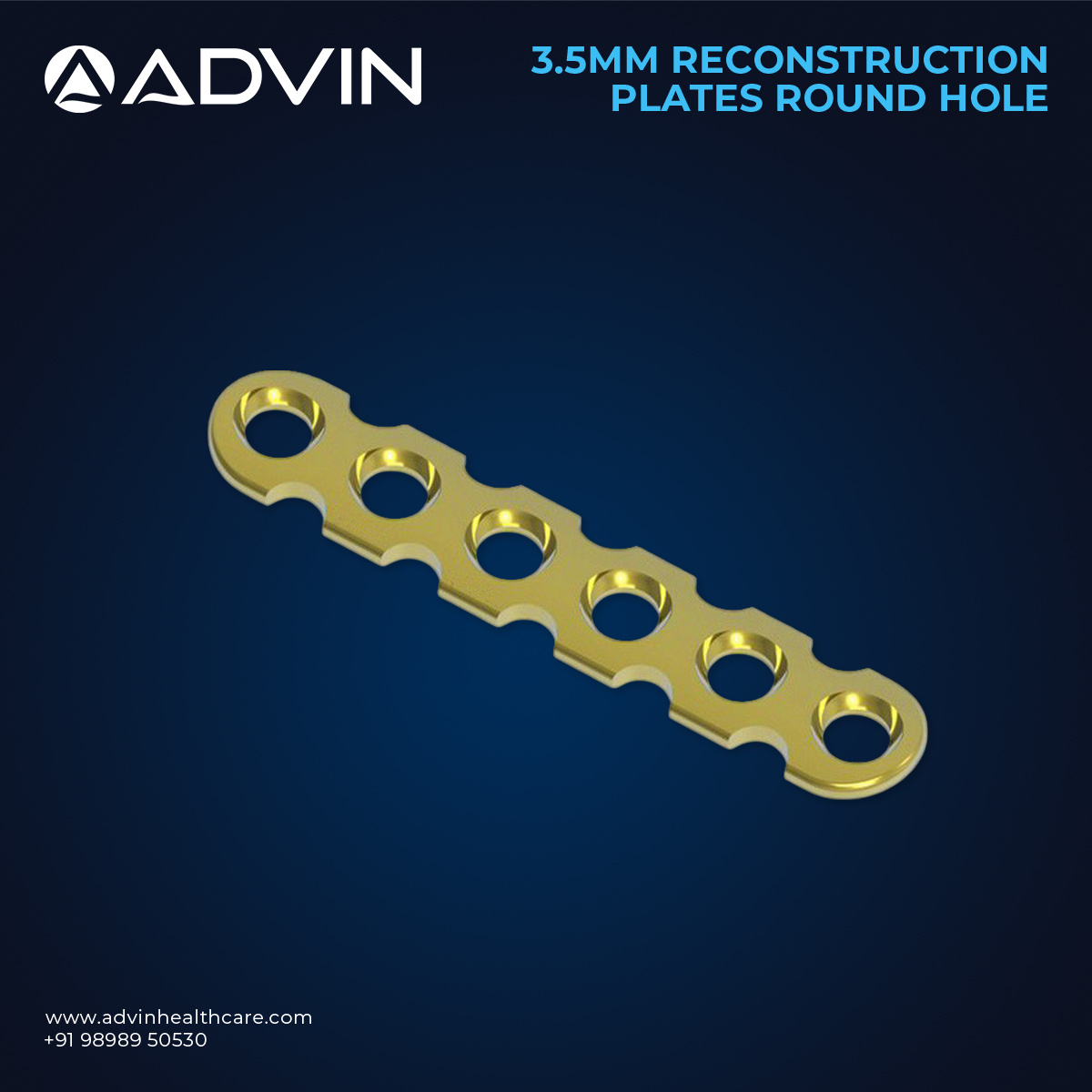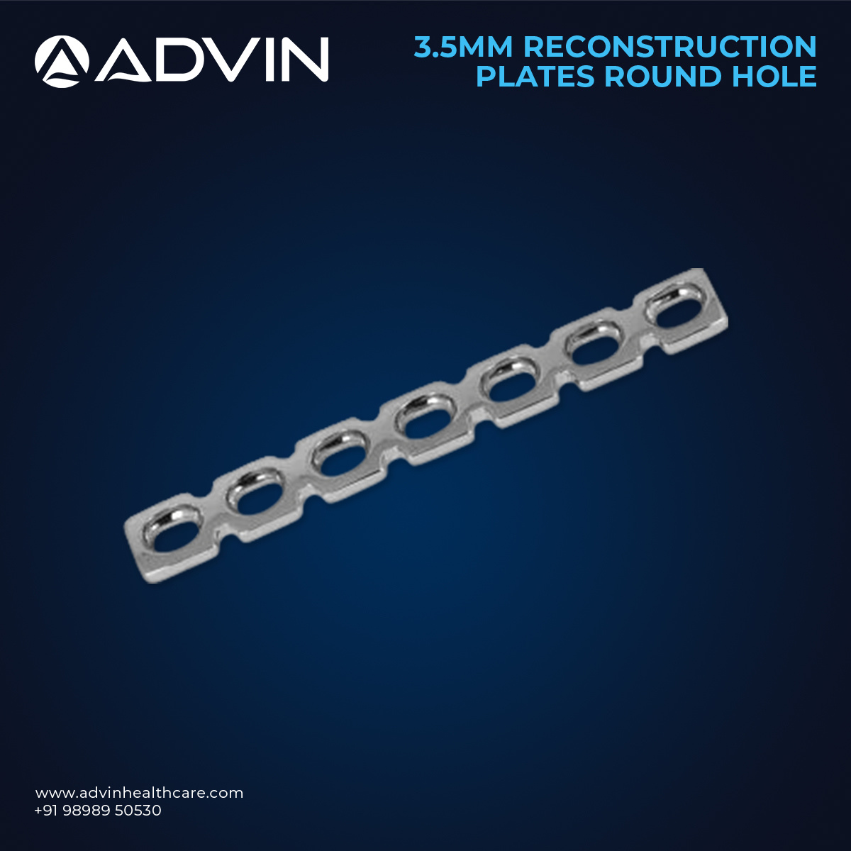 The 3.5mm Reconstruction Plate with round hole is ideal for managing fractures in small bones, periarticular regions, and areas with irregular anatomy. Its round holes allow flexible screw placement, giving surgeons the ability to adjust fixation according to the fracture pattern. This plate supports stable mechanical alignment, reduces the risk of malunion, and promotes effective healing. Advin Health Care manufactures these plates using high-quality stainless steel and titanium, ensuring biocompatibility, strength, and long-lasting performance in trauma and reconstructive orthopedic procedures.