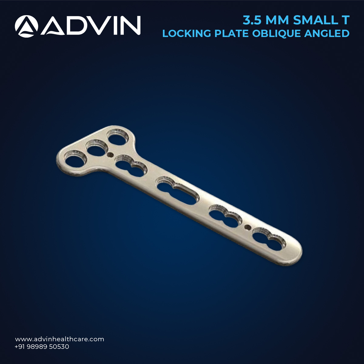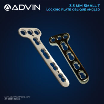 The 3.5mm Small T Locking Plates Oblique Angled are specially designed trauma implants that provide secure fixation for small bone fractures. Manufactured using high-grade stainless steel or titanium, they offer strength and long-lasting durability. Advin Health Care delivers these plates with precise hole placement and smooth finishing to ensure safe and effective use in surgeries. The oblique angled design is particularly useful for treating fractures near bone ends, offering flexibility in positioning and reliable healing support.