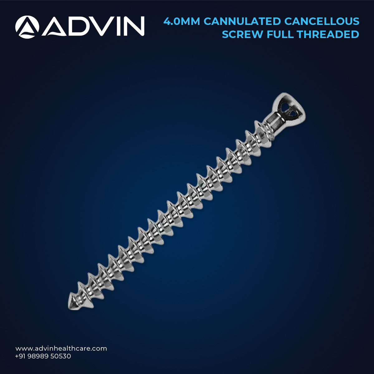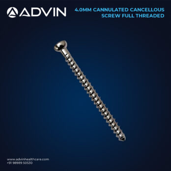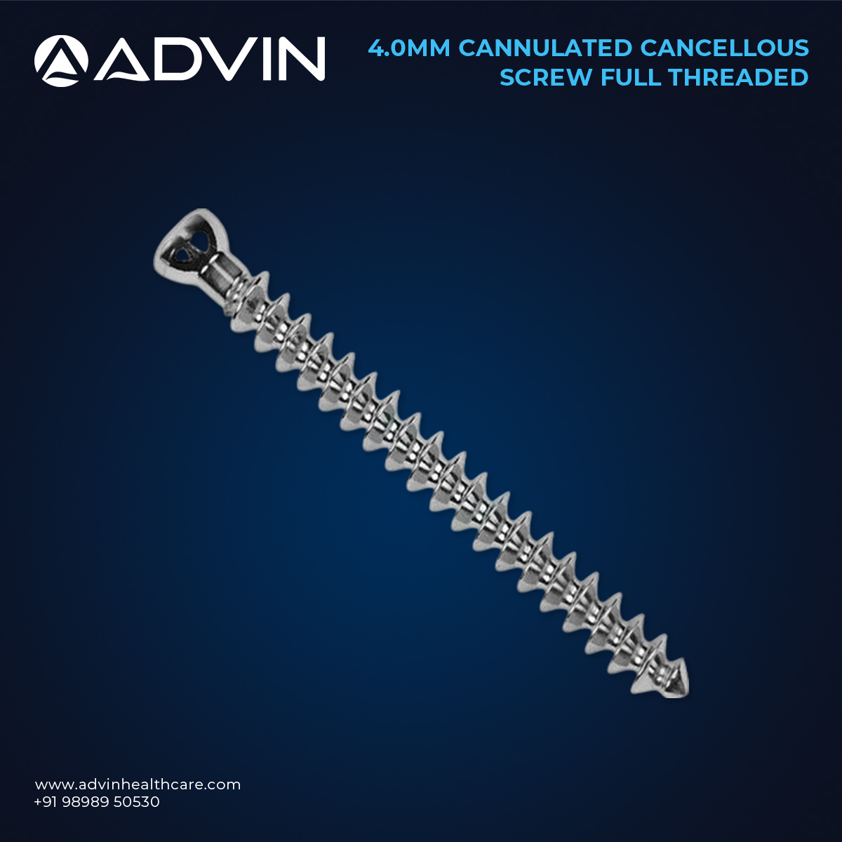 The 4.0mm Cannulated Cancellous Screw (Full Threaded) is used in orthopedic trauma procedures for fractures involving cancellous bone, such as the proximal femur, distal radius, or metaphyseal regions. Its cannulated design allows precise insertion over a guide wire, improving accuracy and reducing surgical time. The full threading provides uniform purchase throughout the bone, enhancing stability and minimizing the risk of loosening. Advin Health Care manufactures these screws using premium stainless steel and titanium, ensuring biocompatibility, durability, and reliable performance in orthopedic applications.
