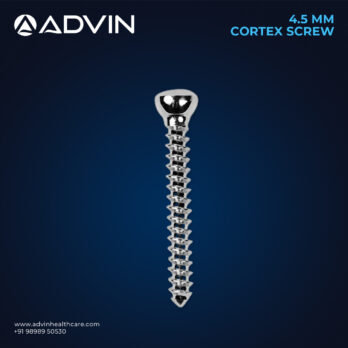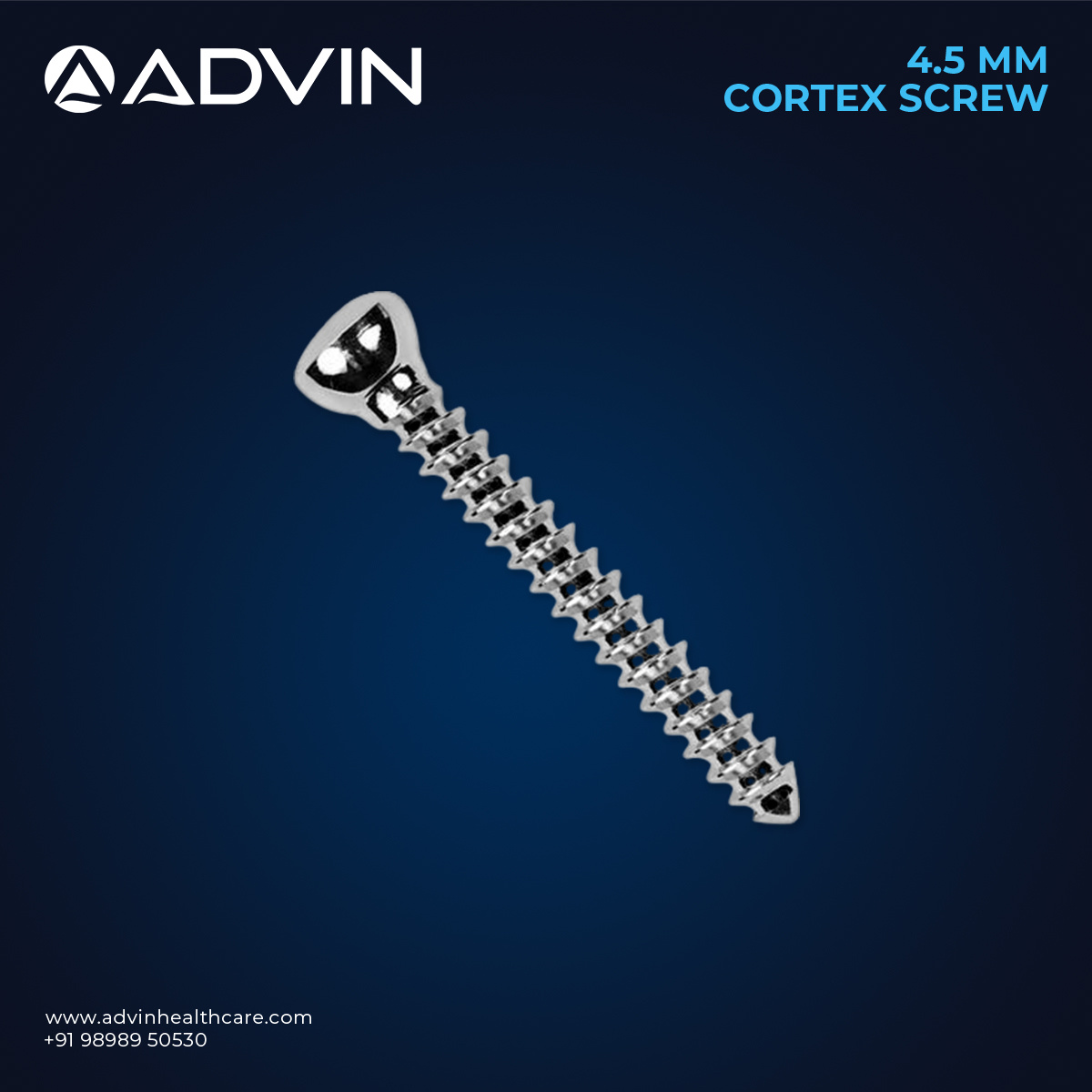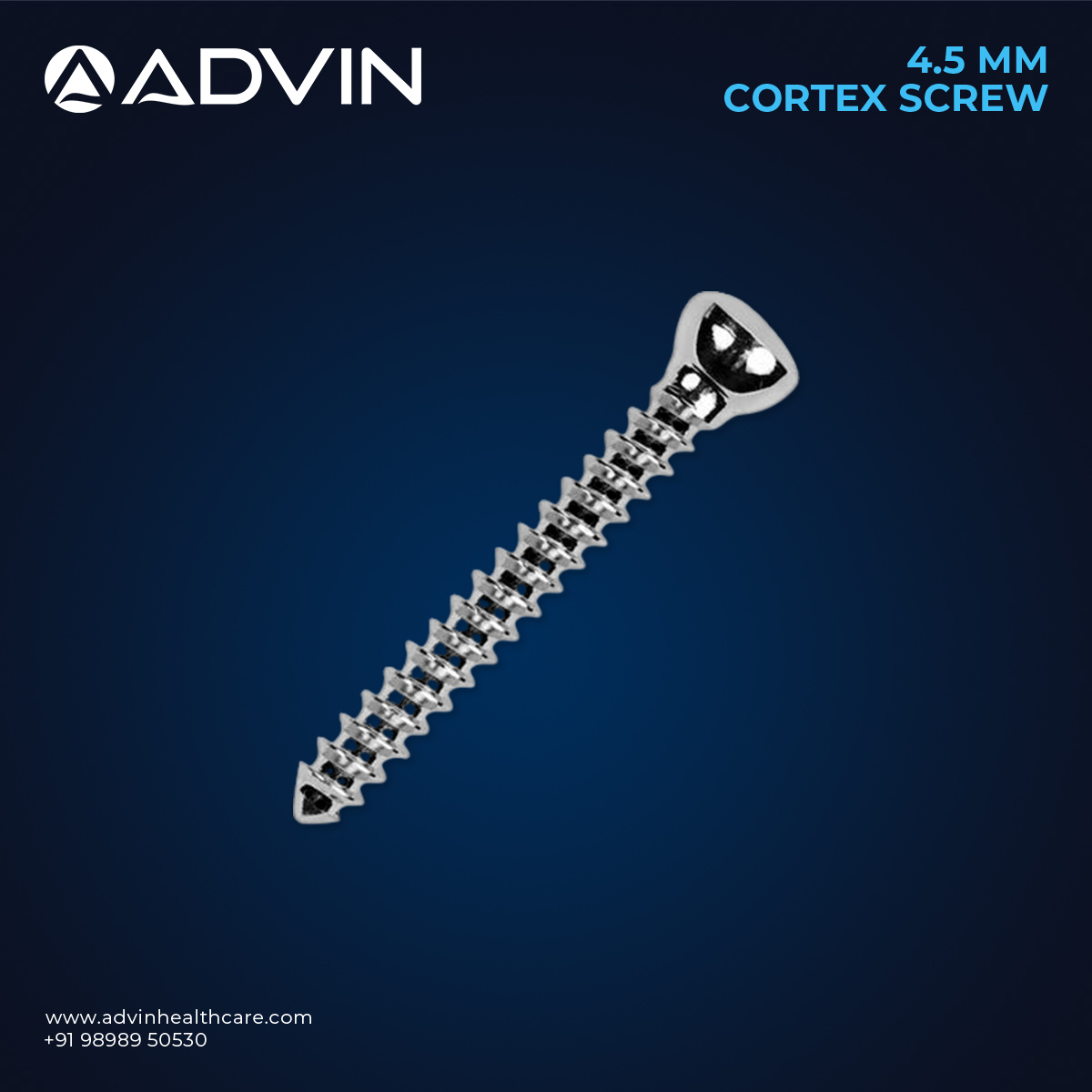 The 4.5mm Cortex Screw is a high-strength orthopedic implant used in trauma and reconstructive surgeries. It provides secure fixation in cortical bone for medium to large fractures. This screw ensures stable alignment and promotes effective bone healing.