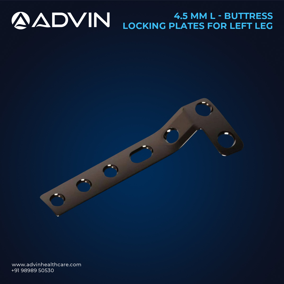 The 4.5mm L-Buttress Locking Plates for Left Leg are designed to stabilize complex fractures of the distal femur, tibia, and other anatomical regions requiring rigid fixation. Manufactured from medical-grade stainless steel or titanium, these implants offer excellent strength, durability, and secure screw fixation. Advin Health Care provides these plates with accurate dimensions and smooth surface finishing to meet international surgical standards. The left-leg specific design helps surgeons achieve accurate anatomical reconstruction, improving patient recovery in orthopedic trauma procedures.