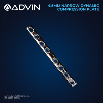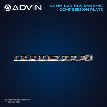 The 4.5mm Narrow Dynamic Compression (DCP) Plate is a specialized trauma orthopedic implant used to achieve rigid internal fixation of fractured bones. This plate is commonly used in long bone fractures and allows dynamic axial compression through specially designed holes. Advin Health Care provides this implant with precise engineering and high-quality medical-grade stainless steel or titanium to ensure patient safety and reliable results. Its narrow design allows easy contouring and positioning, especially in areas with limited soft tissue coverage.