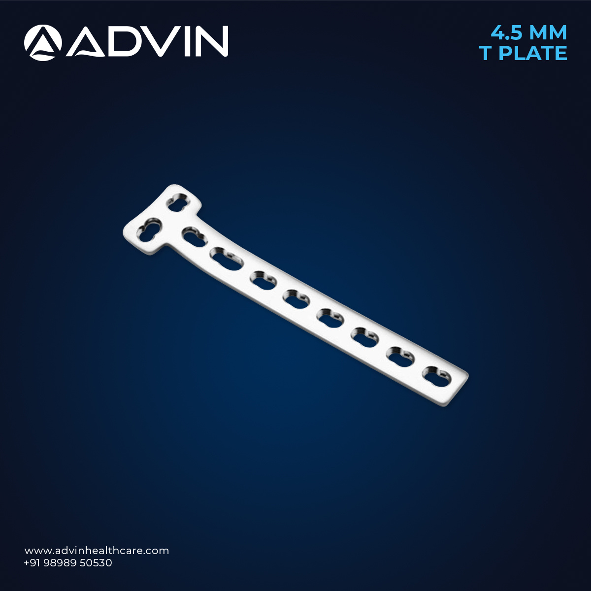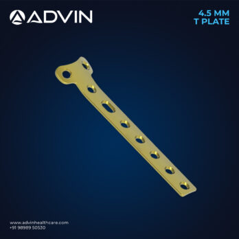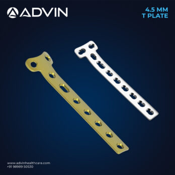 Advin Health Care manufactures premium-quality 4.5mm Surgical T Plates designed for reliable fracture stabilization in trauma surgeries. The implant’s T-shaped structure offers strong fixation and ensures accurate anatomical alignment. It is particularly effective in treating fractures around joints where stability is crucial. Made with biocompatible and durable material, the plate supports faster recovery and long-term functional outcomes.
