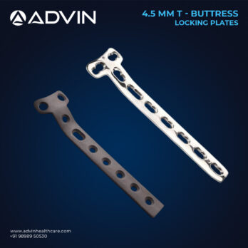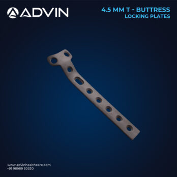 The 4.5mm T-Buttress Locking Plates are specialized orthopedic trauma implants used in the fixation of fractures that require additional buttress support. Their unique T-shape design helps in stabilizing fractures in areas where conventional plates may not provide adequate fixation. Built with high-quality materials, these implants ensure durability and dependable surgical performance. Advin Health Care manufactures these plates with precision, enabling surgeons to achieve stable fixation and faster recovery for patients.