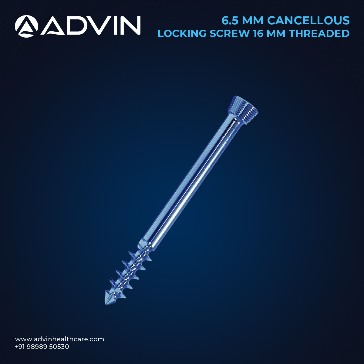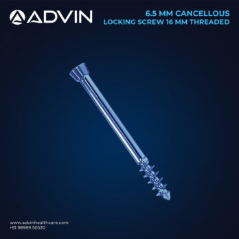 The 6.5mm Cancellous Locking Screws with 16mm threading are precision-engineered implants intended for reliable fixation in areas of spongy bone, such as the metaphysis. Their threaded design ensures secure locking into plates, reducing the risk of loosening and promoting optimal bone healing. Made from high-quality, durable materials, these screws offer dependable performance in surgical applications. Advin Health Care manufactures these screws with strict quality standards, supporting surgeons in achieving precise and stable fracture stabilization.