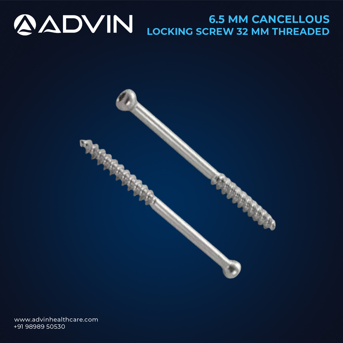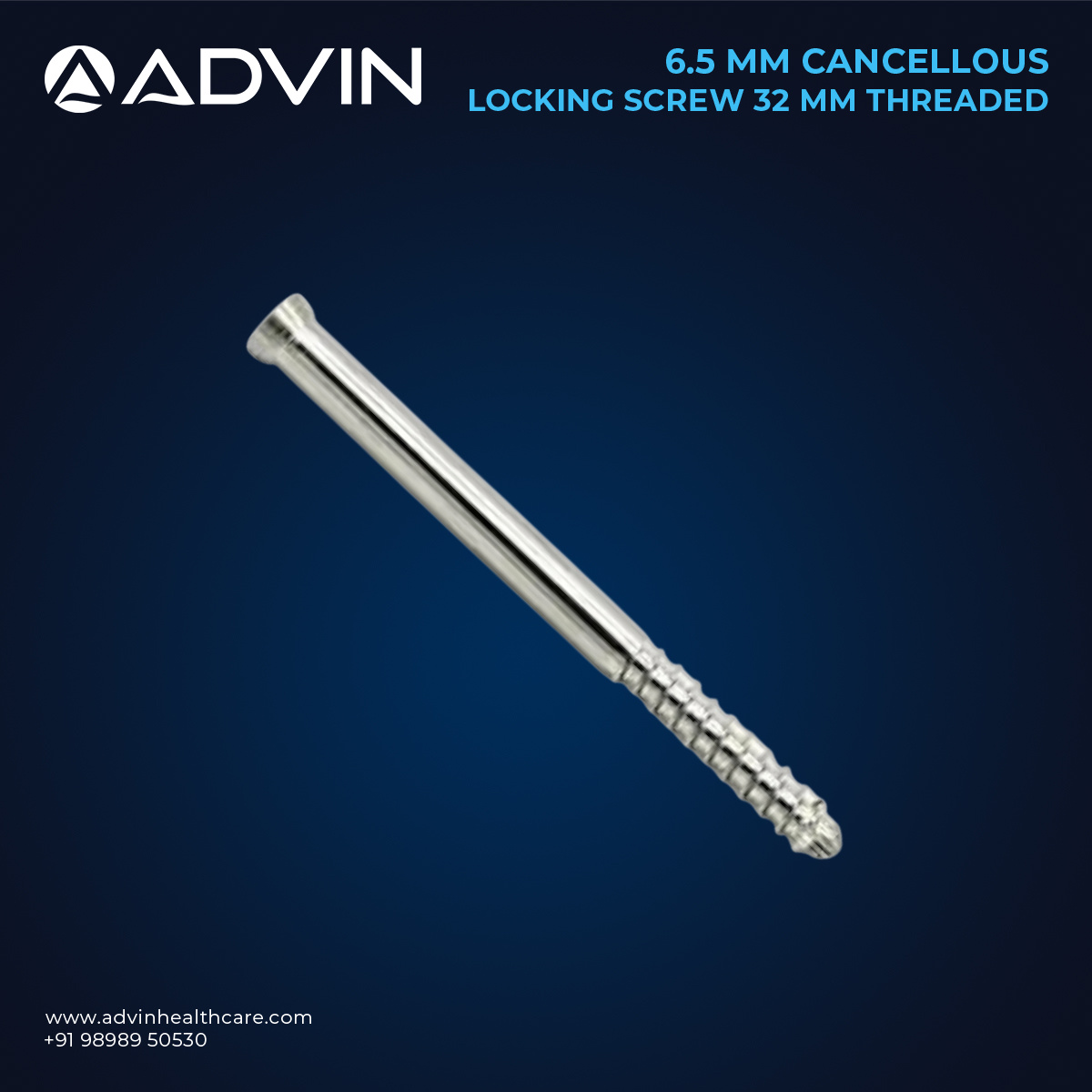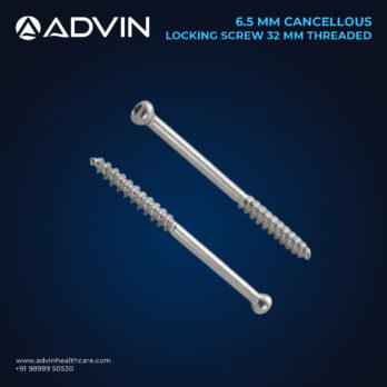 The 6.5mm Cancellous Locking Screws with 32mm threading are precision-engineered implants intended for stable fixation in metaphyseal or spongy bone regions. Their extended threaded design ensures strong locking into plates, reducing the risk of loosening and supporting optimal bone healing. Made from high-quality, durable materials, these screws deliver reliable performance in surgical applications. Advin Health Care manufactures these implants with strict quality standards, assisting surgeons in achieving secure and stable fracture stabilization.