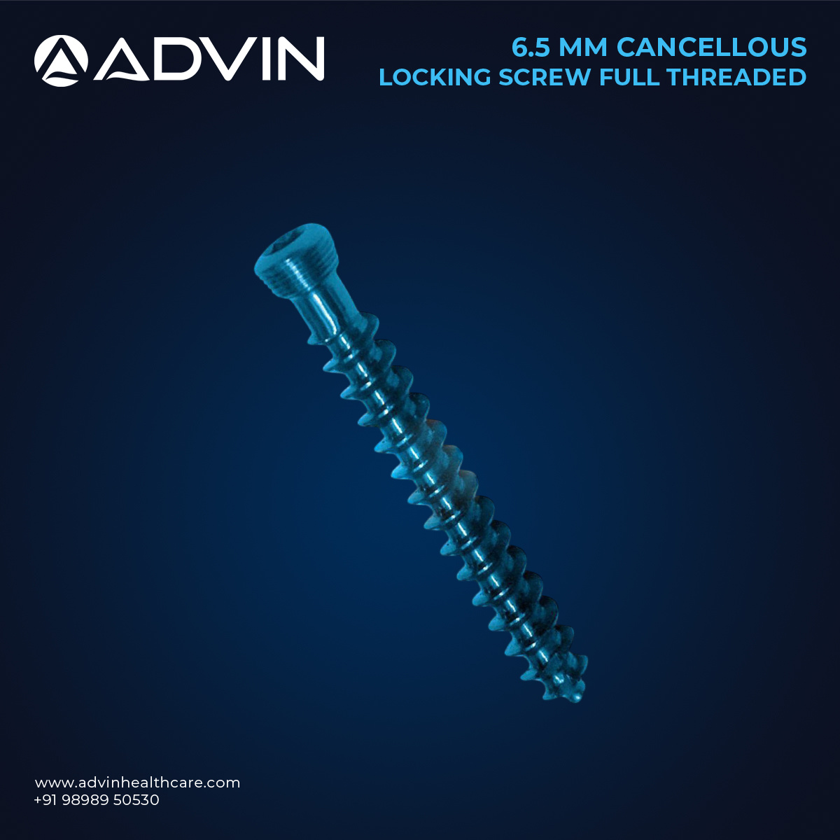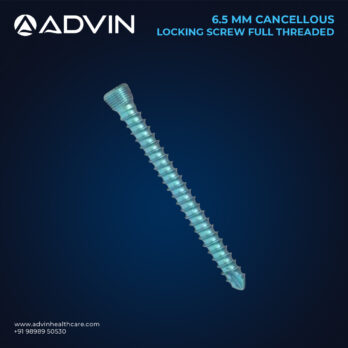 The 6.5mm Cancellous Locking Screw (Full Threaded) provides surgeons with reliable fixation for fractures in cancellous bone areas. Its full threaded body allows complete engagement with the bone, enhancing pullout strength and stability during fracture healing. Manufactured from high-grade biocompatible materials, this screw ensures durability and consistent surgical outcomes. Advin Health Care produces these implants with advanced precision and strict quality standards to support effective trauma management.