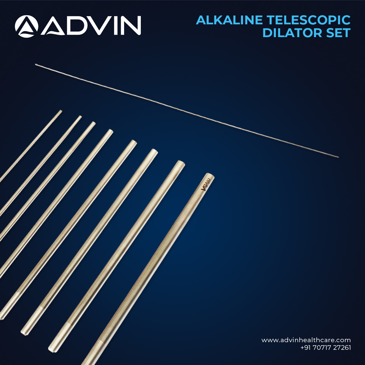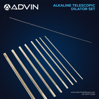 The Alkaline Telescopic Dilator Set is specifically engineered for urology procedures such as PCNL (Percutaneous Nephrolithotomy) and other endoscopic surgeries. It provides a stepwise, controlled dilation of the urinary tract to facilitate safe insertion of sheaths and instruments. Advin Health Care manufactures this set with high-quality materials to ensure durability, accuracy, and safety during clinical use. Its ergonomic design and smooth telescopic mechanism reduce tissue damage, improve procedural precision, and enhance patient recovery, making it an essential tool for modern urological surgeries.