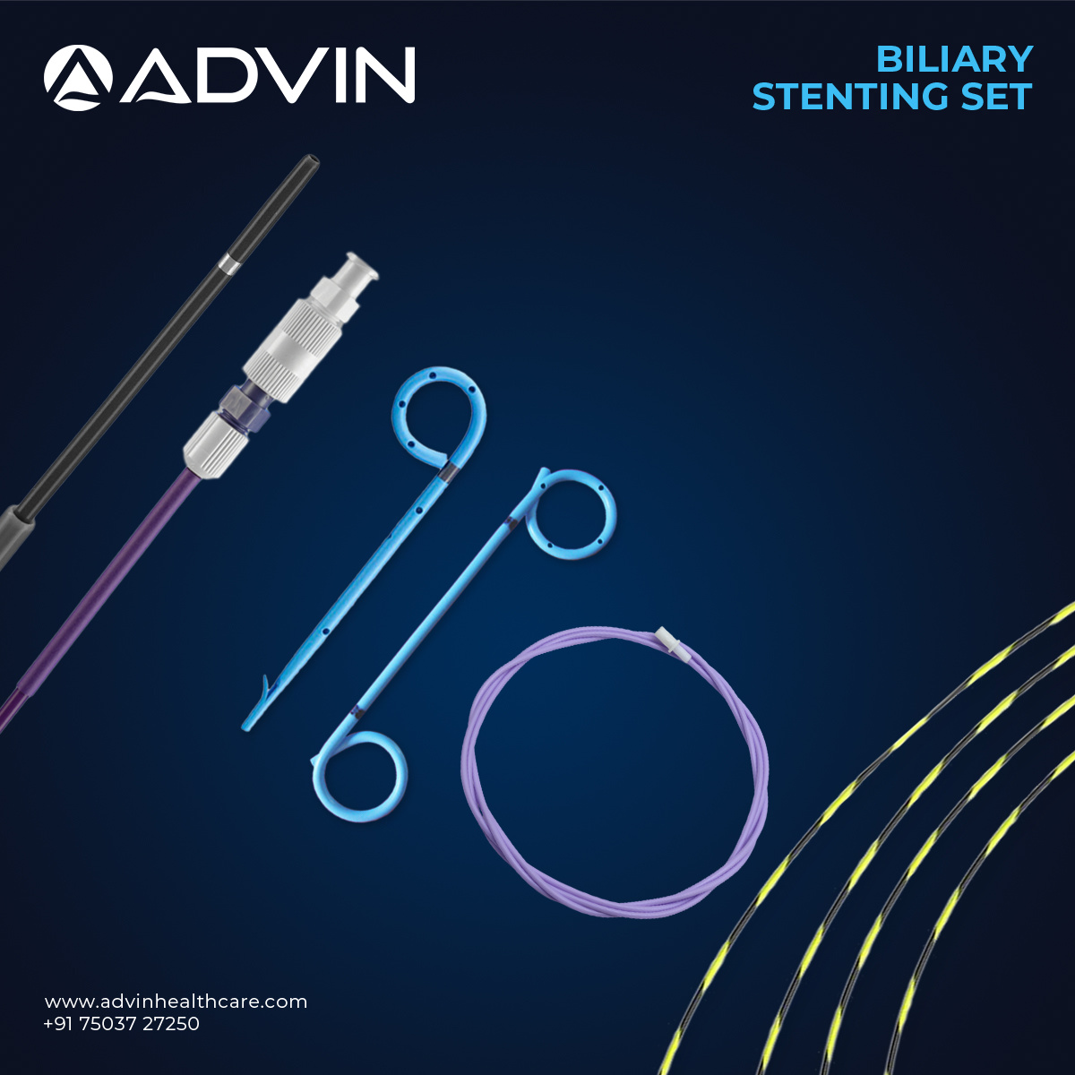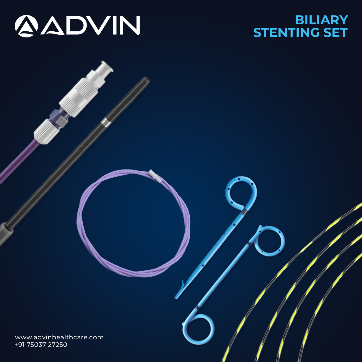 Advin Health Care is globally leading manufacturer and supplier of biliary stenting sets designed for reliable stent placement in biliary interventions. The set combines a biliary plastic stent for maintaining duct patency, a stent pusher for controlled deployment, an introducer set for accurate placement, and an ERCP guide wire for smooth navigation. This integrated solution allows clinicians to perform stenting procedures efficiently with proper control and positioning. Designed for compatibility with standard ERCP systems, the set supports consistent performance in managing both benign and malignant biliary strictures.