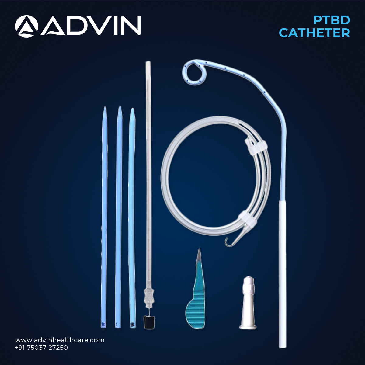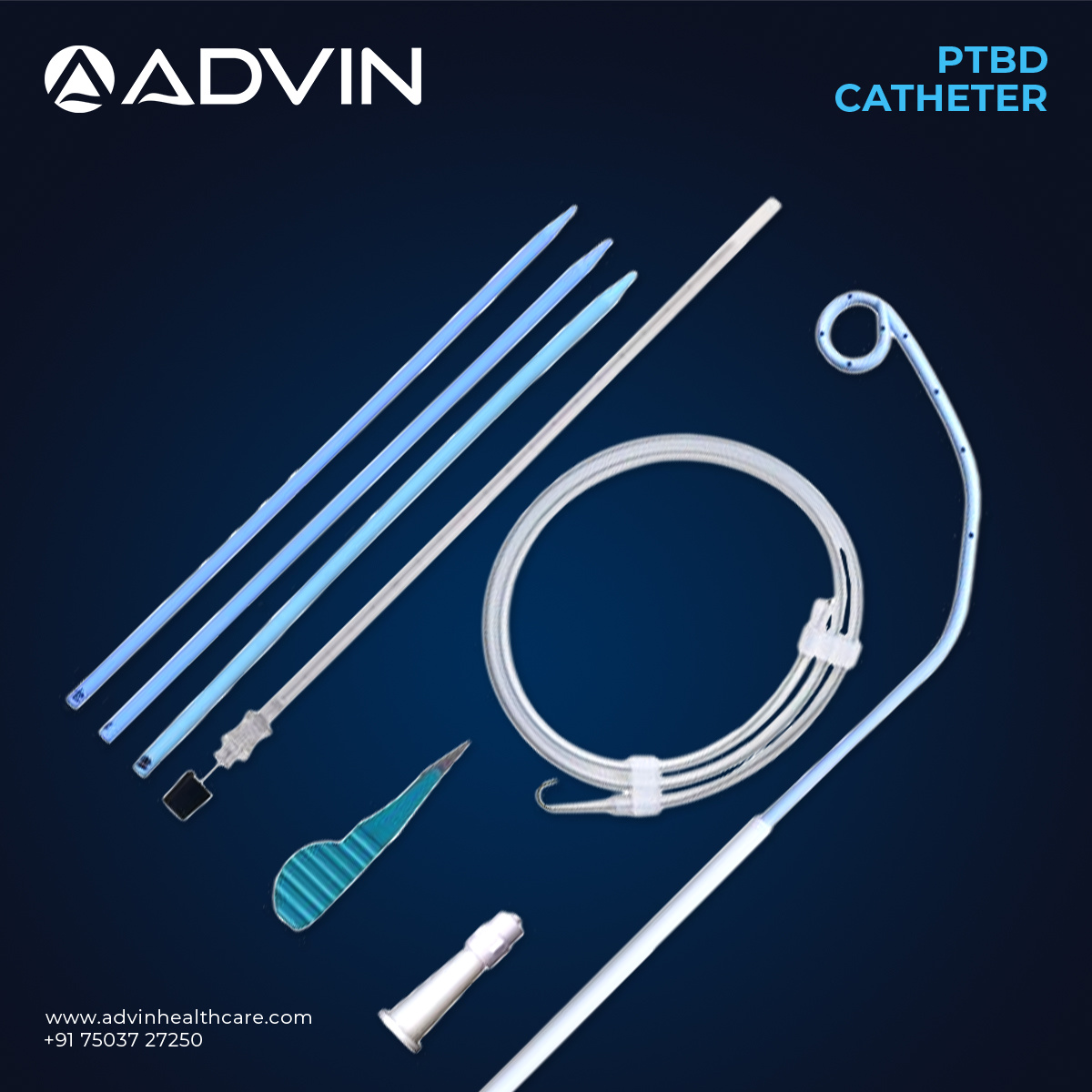 The PTBD Catheter Set from Advin Health Care is an advanced medical device system designed for percutaneous transhepatic biliary drainage (PTBD). It provides an efficient and reliable method for relieving biliary obstruction caused by stones, strictures, or tumors. The set ensures smooth bile drainage from the biliary system to restore normal liver function and reduce biliary pressure.