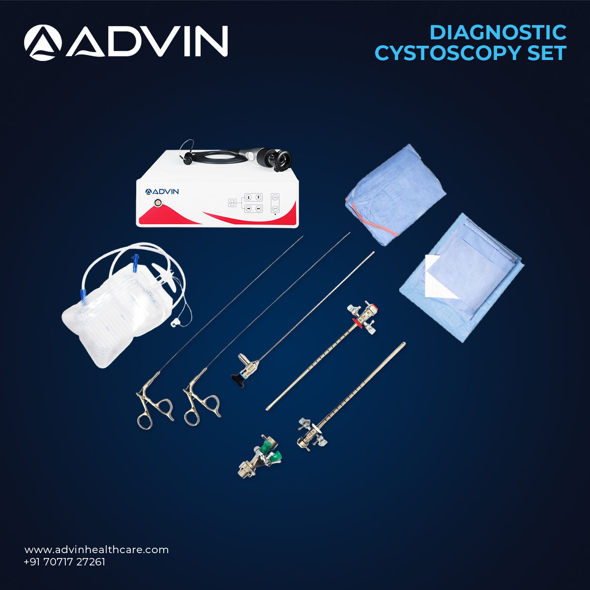 The Diagnostic Cystoscopy Set is developed to provide clear and reliable visualization of the lower urinary tract during diagnostic procedures. It enables clinicians to inspect the bladder lining, detect abnormalities, and perform basic interventions if required. The set typically includes a cystoscope sheath, telescope compatibility, obturator, and essential accessories for complete cystoscopic examination. Manufactured under strict quality standards, Advin Health Care supplies this set to meet the clinical needs of modern urology with precision, durability, and consistent performance.