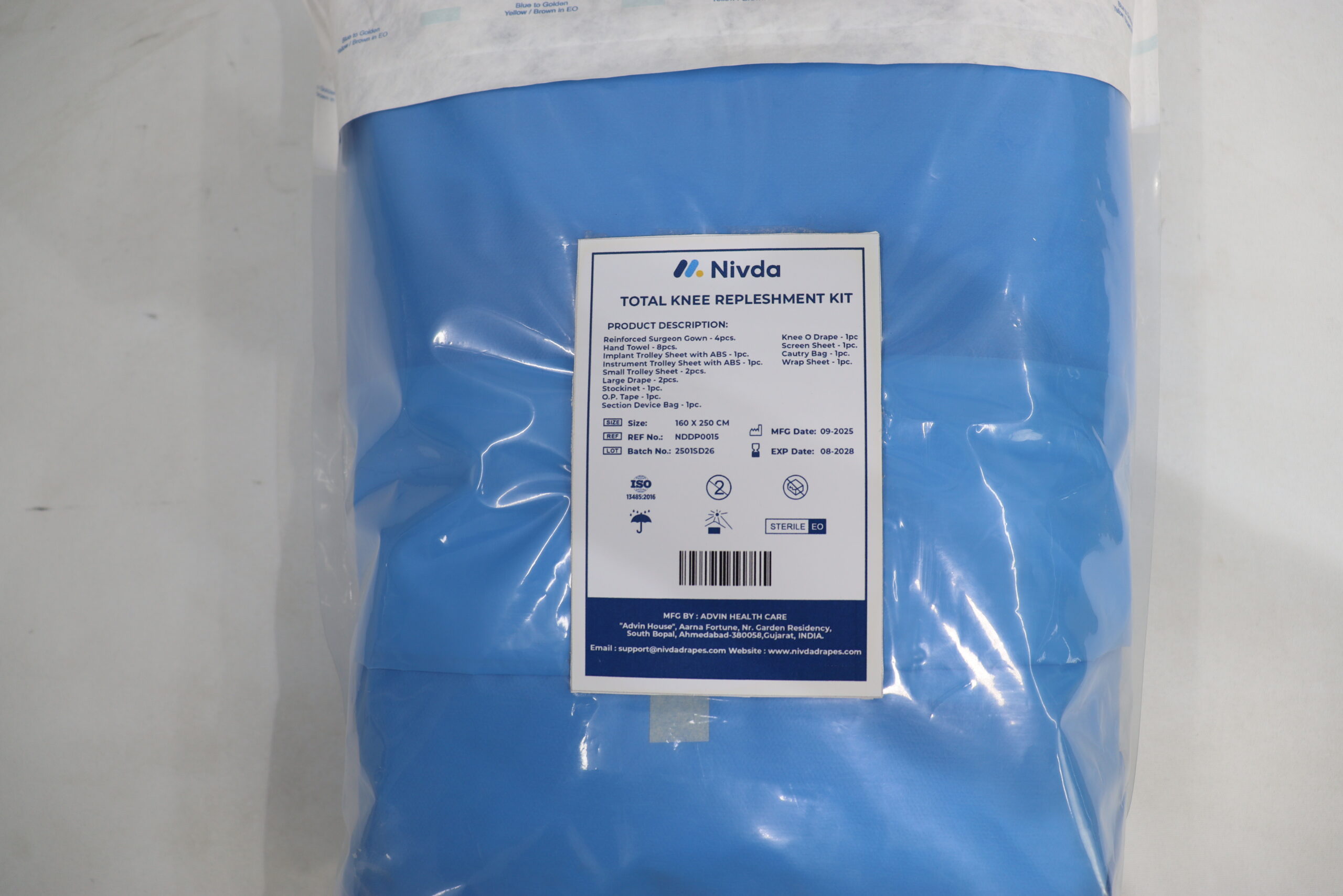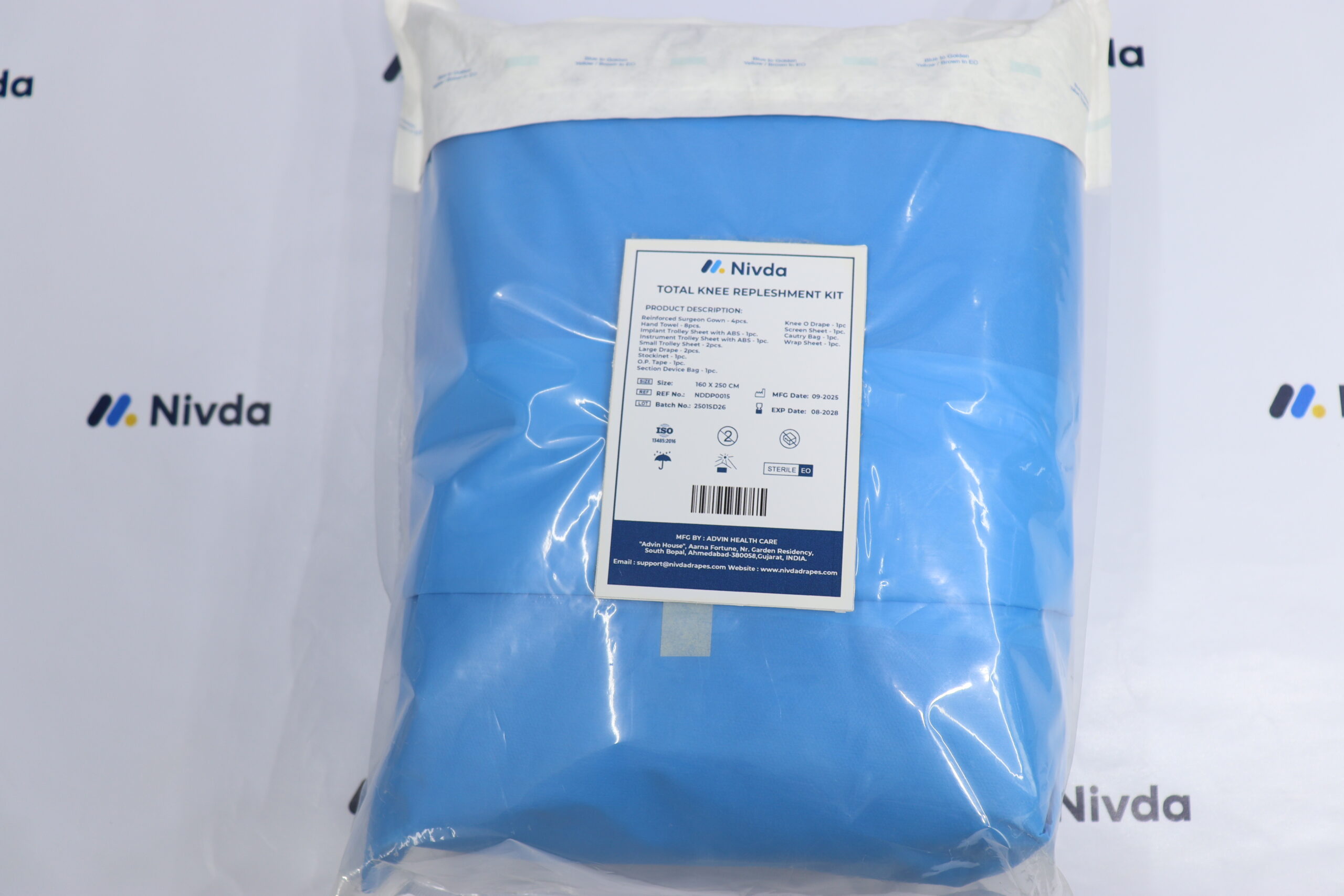 Disposable TKR Drape Kit is a sterile, single-use solution designed specifically for total knee replacement surgeries. It includes fenestrated drapes and fluid collection pouches to maintain a clean, dry, and safe surgical field. Manufactured by Nivda, this kit ensures infection control and efficient OT preparation.