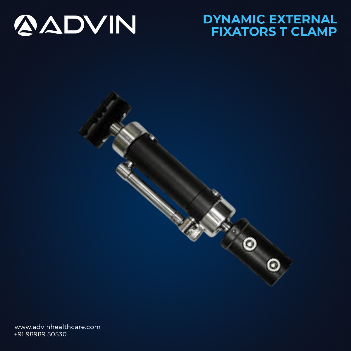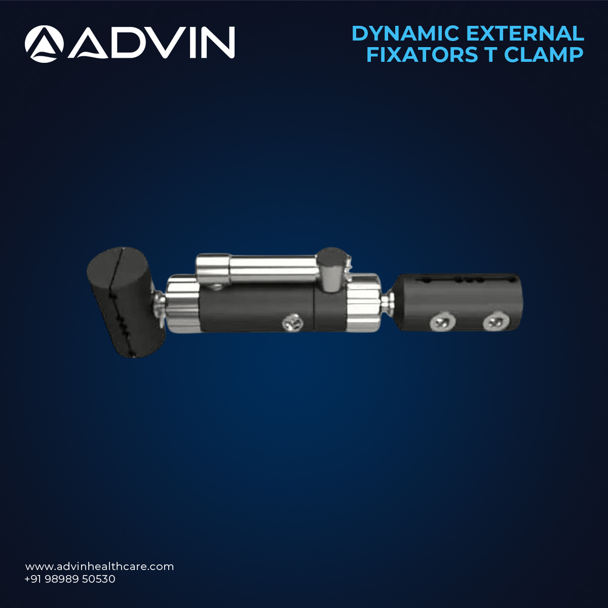 The Dynamic External Fixators T Clamp is designed to connect rods and pins in external fixation systems, particularly for managing complex fractures and deformities. Manufactured from high-quality medical-grade stainless steel or aluminum alloys, it provides excellent durability, corrosion resistance, and mechanical strength. Advin Health Care produces these clamps with precision engineering for accurate adjustment, easy handling, and secure tightening. Its T-shaped design allows multi-directional fixation, making it suitable for various external fixation configurations. This component supports minimally invasive fracture management, enhances surgical efficiency, and promotes faster recovery with stable bone alignment.