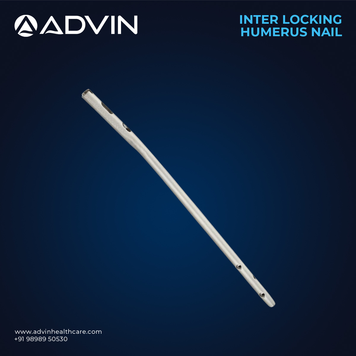 Advin Health Care manufactures precision-engineered Humerus Interlocking Nails designed for effective stabilization of humeral fractures in trauma orthopedic procedures. These nails ensure secure fixation through proximal and distal locking screws, offering excellent rotational and axial stability. They are ideal for complex, comminuted, and pathological fractures of the humerus. Made from high-quality stainless steel or titanium, Humerus Interlocking Nails provide strong fixation, promote rapid recovery, and ensure long-term durability.