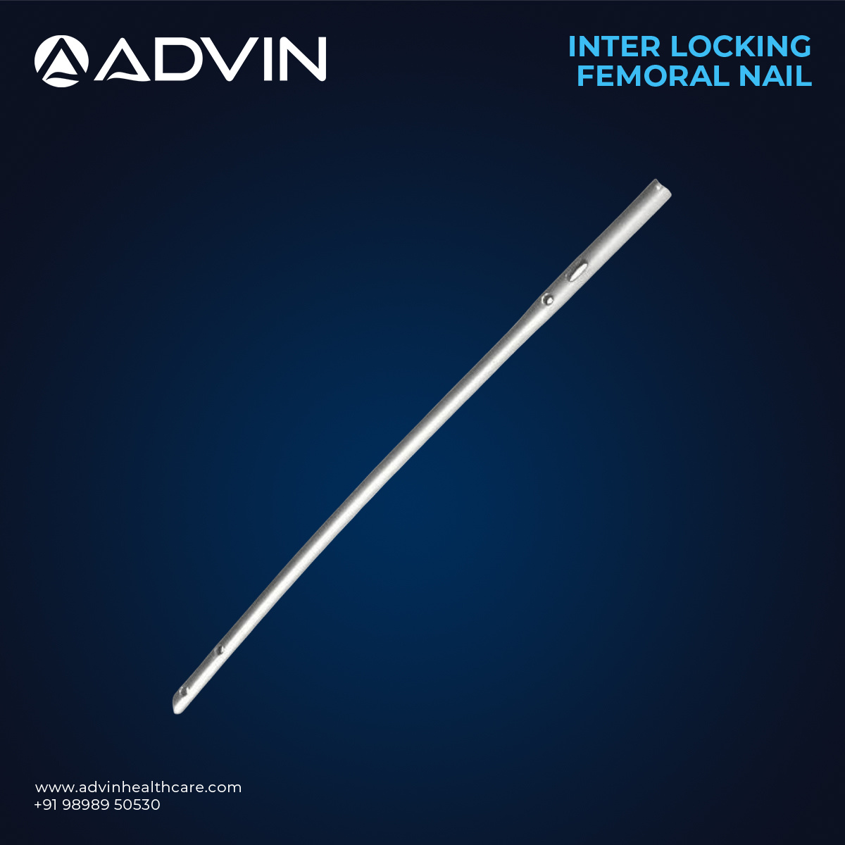 Advin Health Care manufactures high-quality Interlocking Nails designed for precise stabilization of long bone fractures in trauma orthopedic surgeries. The nails provide both axial and rotational stability through interlocking screws, reducing the risk of malalignment or implant failure. They are ideal for comminuted, displaced, or osteoporotic fractures where conventional fixation may not be sufficient. Made from biocompatible stainless steel or titanium, Interlocking Nails offer durable fixation and improved patient recovery outcomes.