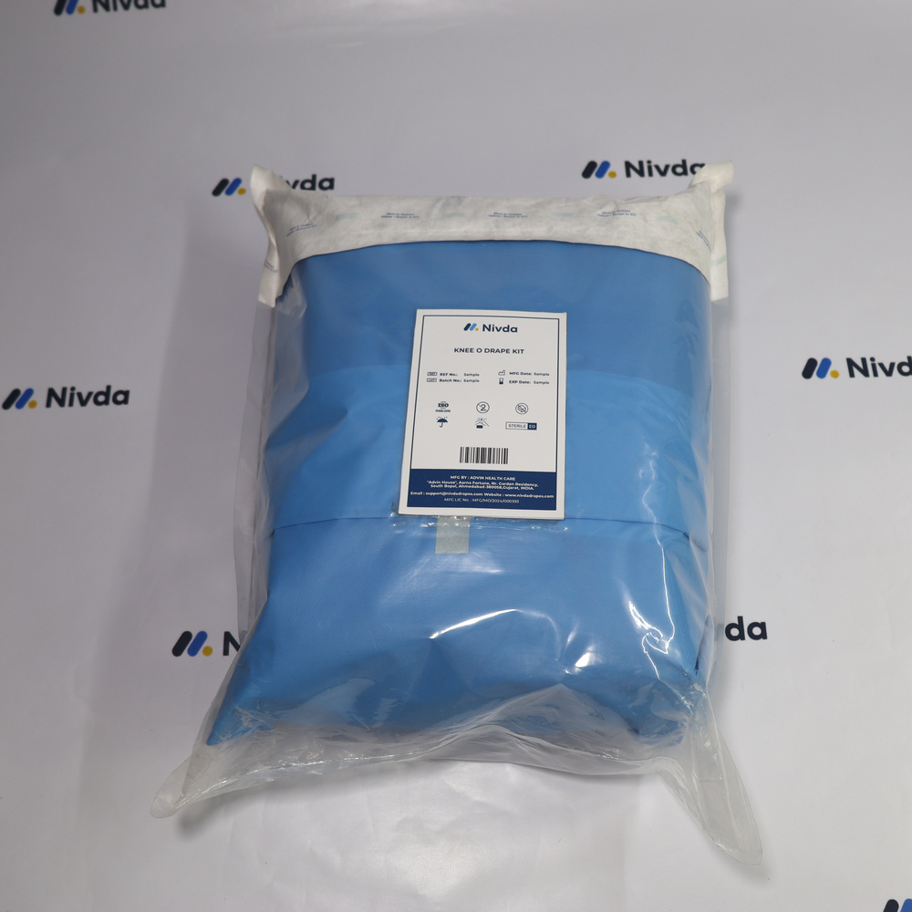 Knee Joint Surgery Drape Kit is a sterile, single-use draping solution designed for knee joint surgeries, including arthroscopy and replacement procedures. It provides a secure sterile barrier, precise fenestration for surgical access, and fluid control features to maintain a clean operating field. Manufactured by Nivda, this kit helps ensure patient safety and efficient OT preparation.