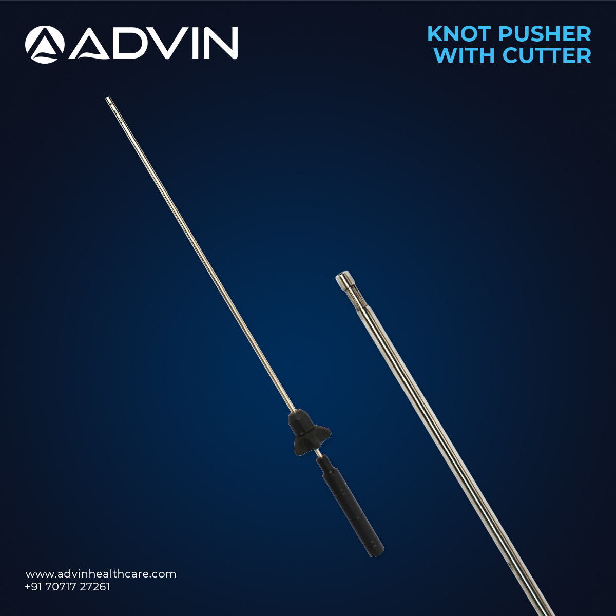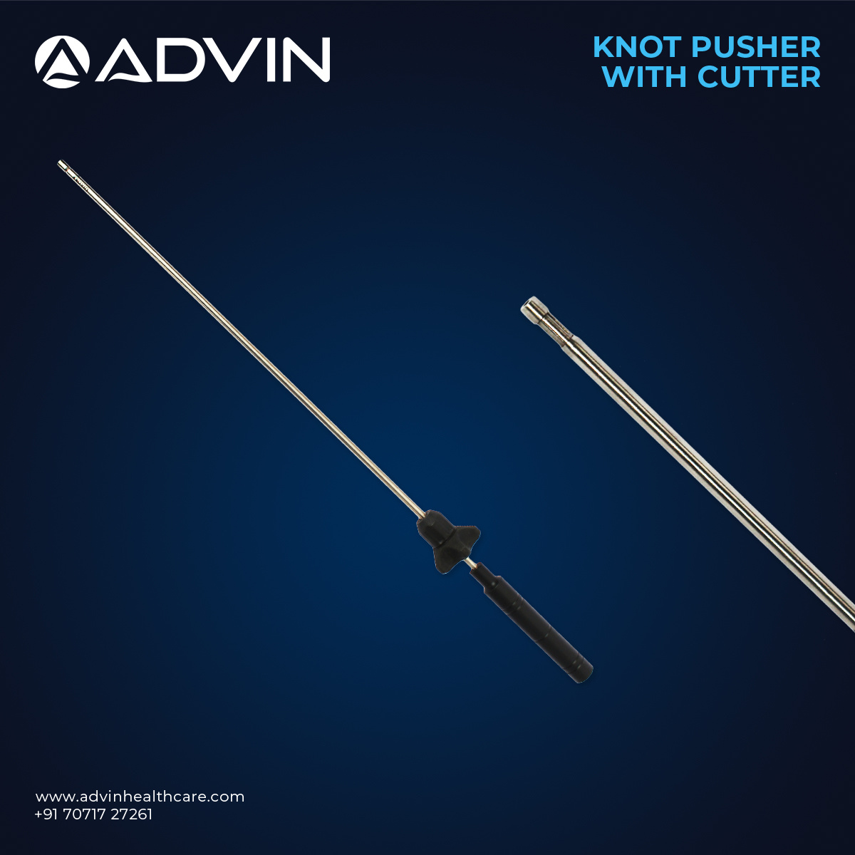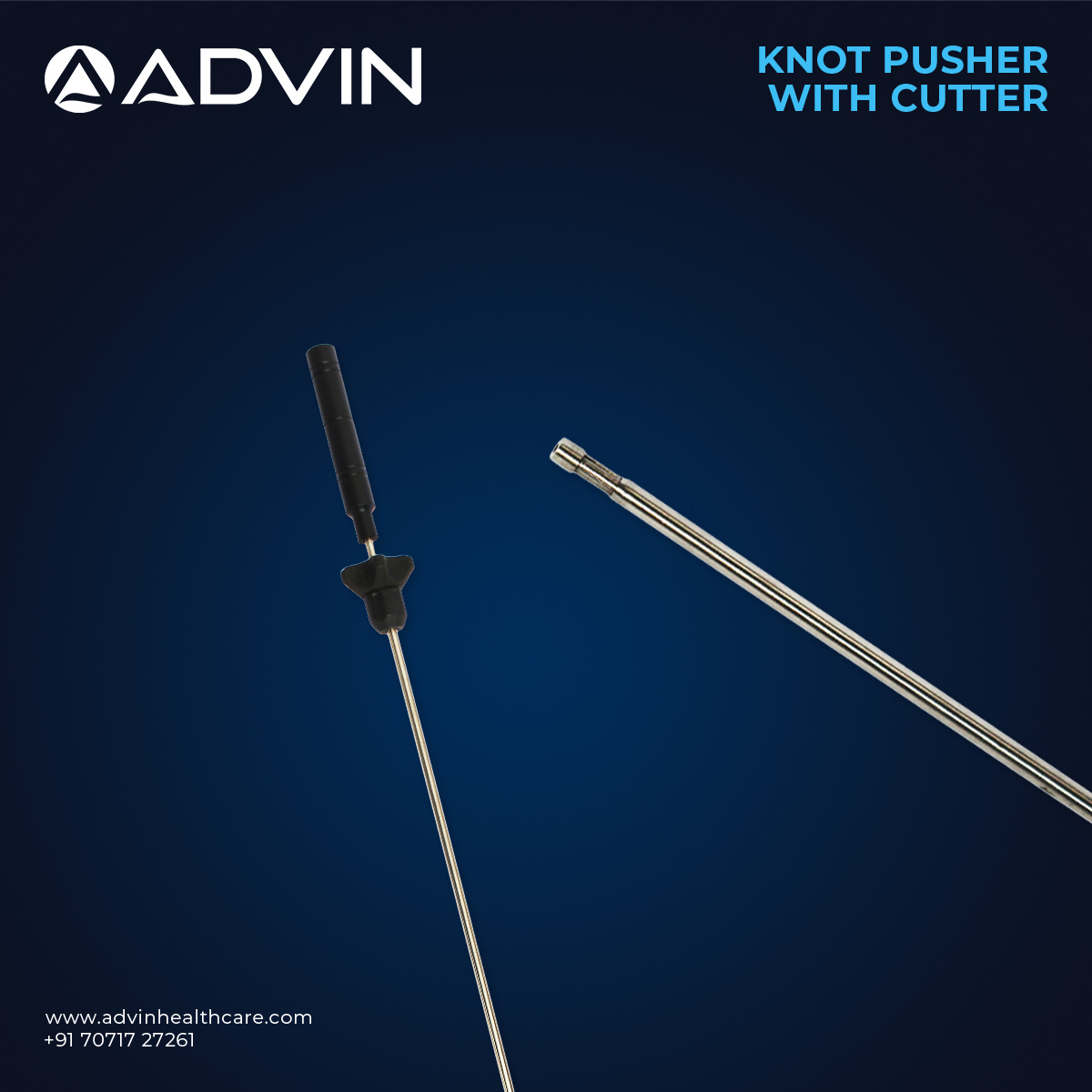 The laparoscopic knot pusher with cutter is designed to assist surgeons in advancing knots and cutting sutures during laparoscopic suturing procedures. It allows precise knot placement while providing an integrated cutting mechanism to trim excess suture material without changing instruments. The slim shaft design enables easy insertion through laparoscopic ports and smooth maneuverability within confined surgical spaces. Manufactured under strict quality standards, Advin Health Care supplies durable and reliable knot pusher instruments that ensure consistent performance in modern minimally invasive surgeries.