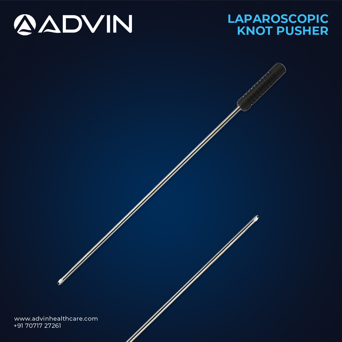 The laparoscopic knot pusher is designed to assist surgeons in advancing and securing surgical knots during laparoscopic suturing. It allows precise knot placement while maintaining control in confined surgical spaces within the abdomen. The slim shaft design enables easy insertion through laparoscopic ports and smooth maneuverability during procedures. Manufactured under strict quality standards, Advin Health Care supplies durable and reliable knot pushers that ensure consistent performance and support efficient suturing in modern minimally invasive surgeries.