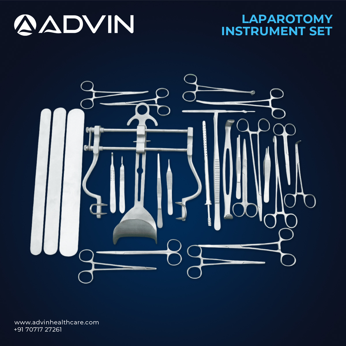 - Comprehensive set of instruments for laparotomy procedures