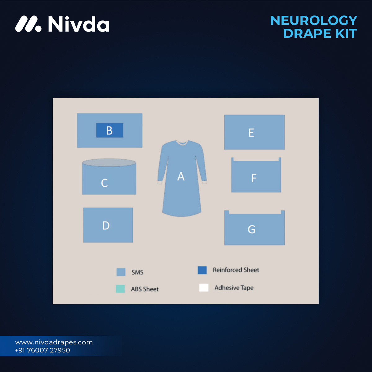 Neurology Drape Kit is a complete, sterile draping solution designed for neurological and neurosurgical procedures. It provides a sterile barrier around the surgical site, ensuring patient safety and infection control. Manufactured by Nivda, this kit helps streamline OT setup and maintain aseptic conditions during delicate brain and spine surgeries.