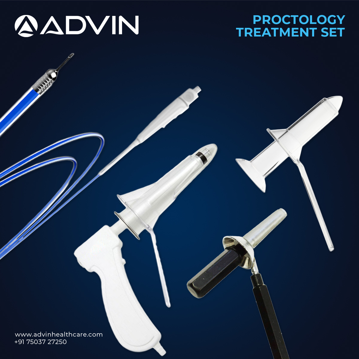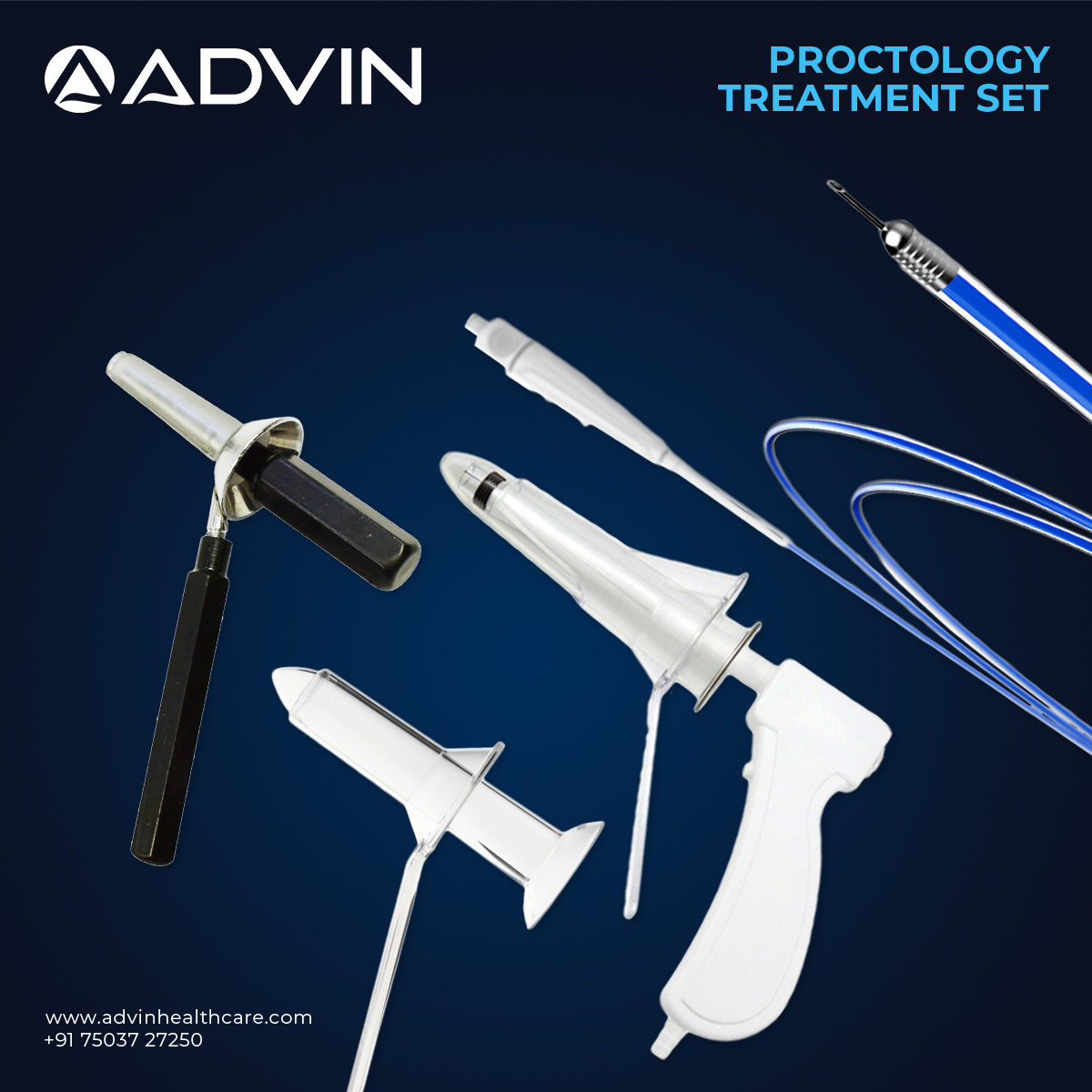 Advin Health Care is globally leading manufacturer and supplier of proctology treatment sets designed for effective management of anorectal disorders in clinical practice. The set includes a proctoscope for clear visualization of the rectal canal, a hemorrhoid band ligator for ligation of internal hemorrhoids, and a sclerotherapy needle for targeted injection therapy. This combination allows clinicians to perform both diagnostic evaluation and therapeutic intervention in a single setup. Designed for ease of use and compatibility with standard techniques, the set supports safe, efficient, and minimally invasive proctology procedures.