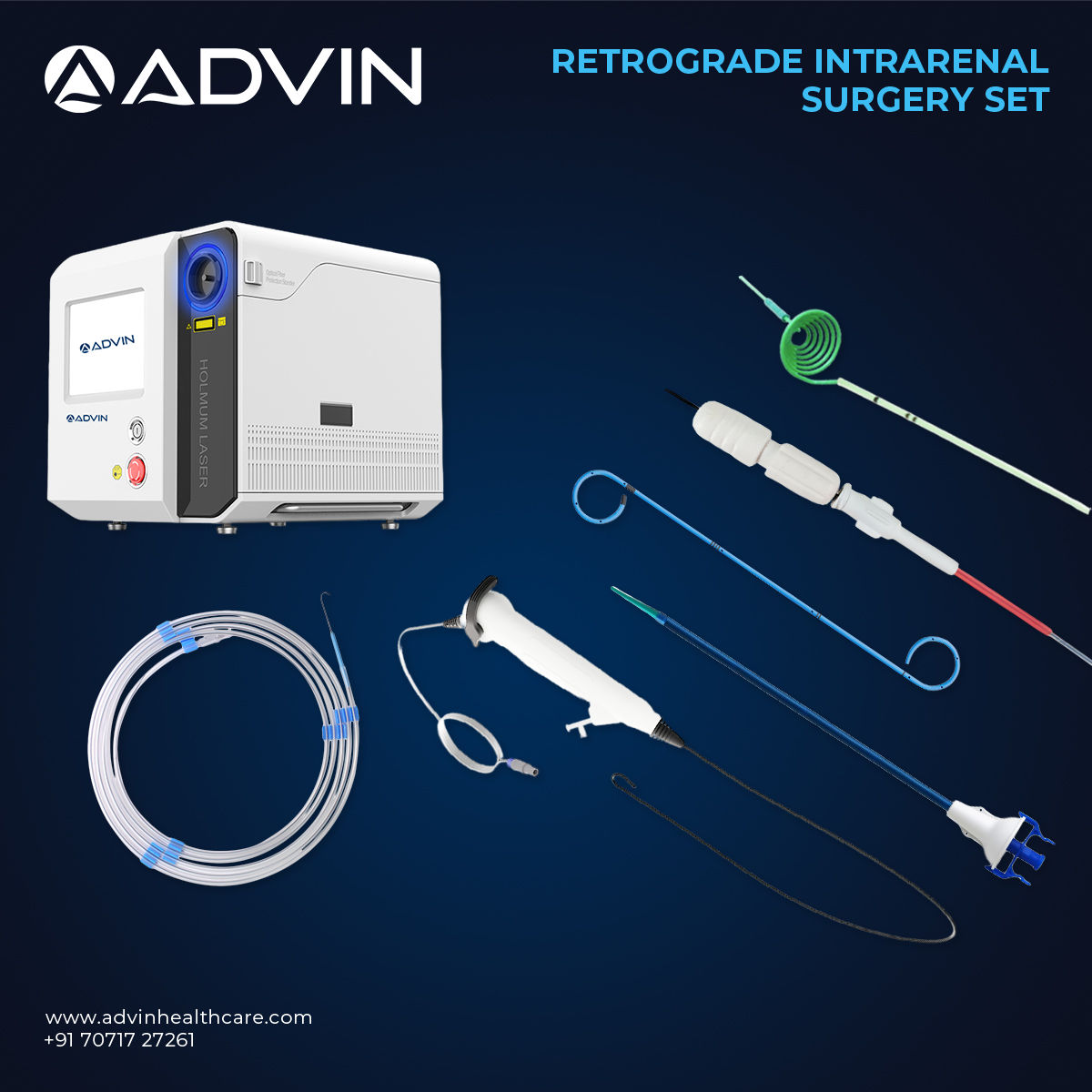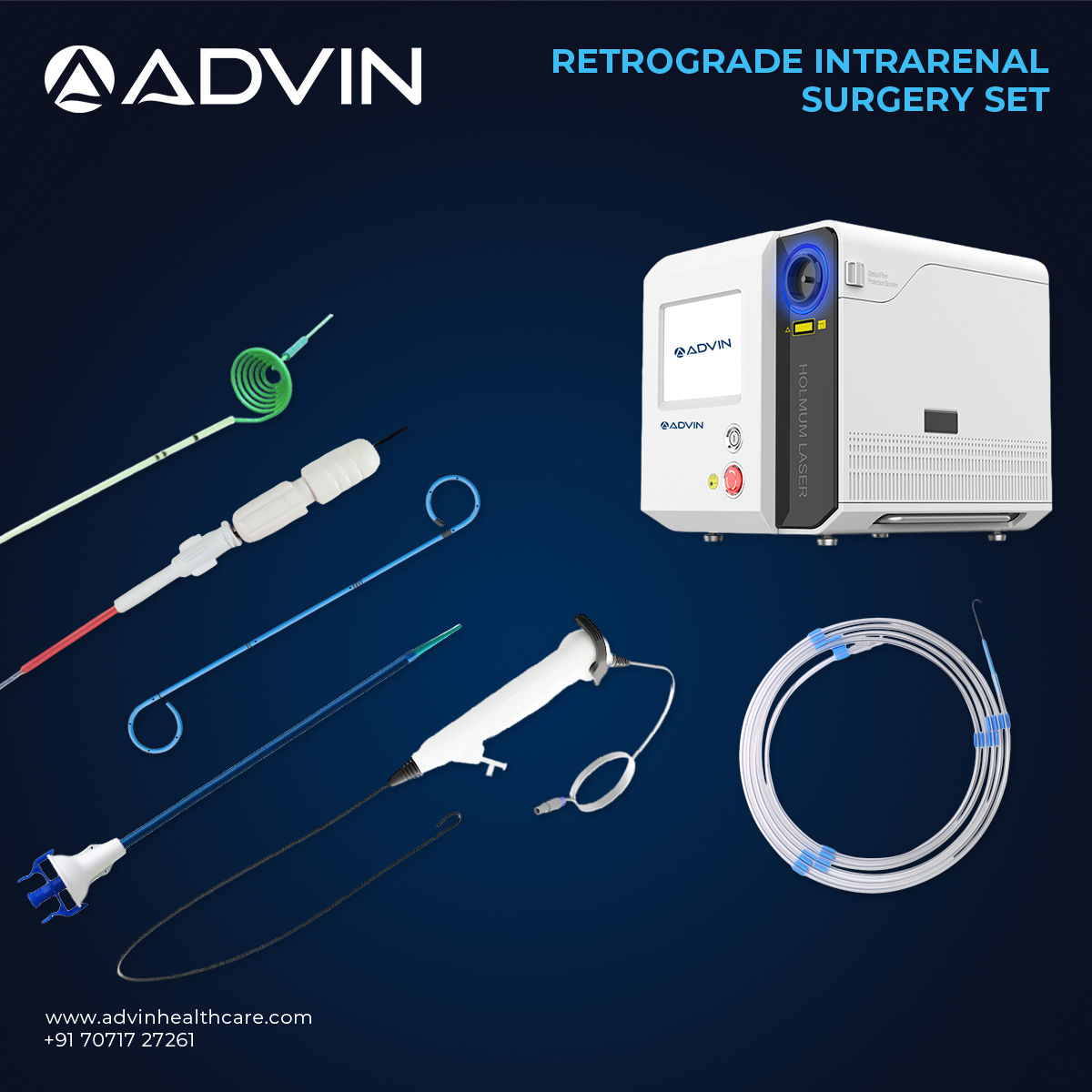 The Retrograde Intrarenal Surgery Set is designed to provide safe and efficient access to the kidney for diagnostic and therapeutic procedures such as stone removal. It enables surgeons to navigate through the ureter into the renal pelvis using flexible endoscopic instruments. The set typically includes a flexible ureteroscope, access sheath, guidewires, and essential accessories required for complete RIRS procedures. Manufactured under strict quality standards, Advin Health Care supplies this system to meet the clinical performance, precision, and safety requirements of modern urology practice.
