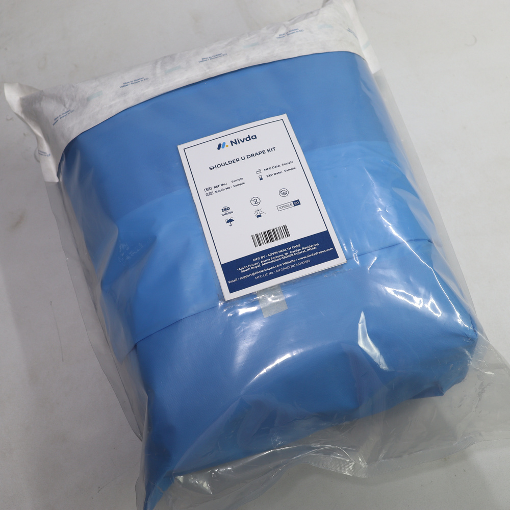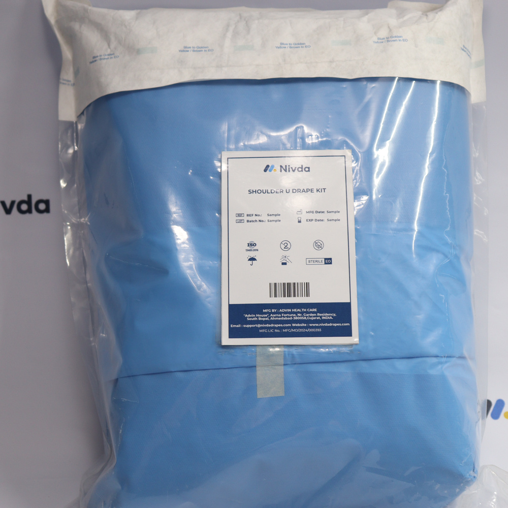 Shoulder U Drape Kit is a sterile, single-use draping solution designed for shoulder surgeries and arthroscopy procedures. It features a U-shaped fenestrated drape that provides optimal access to the surgical site while maintaining a contamination-free environment. Manufactured by Nivda, this kit ensures patient safety and reduces OT preparation time.