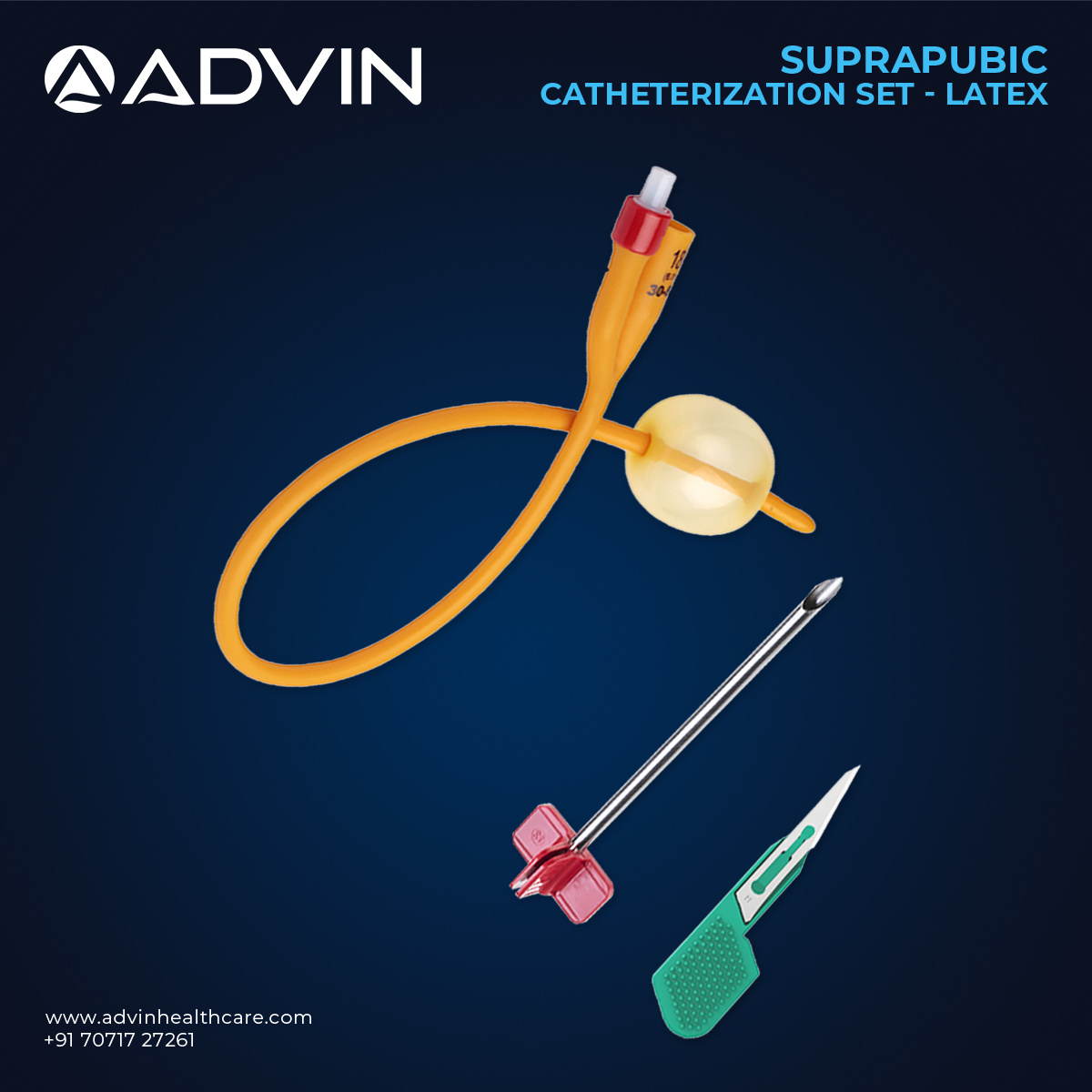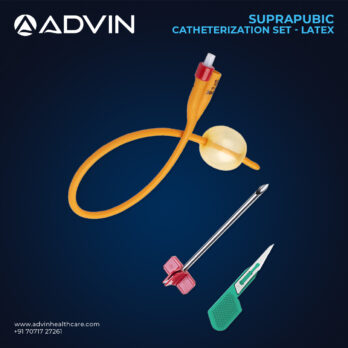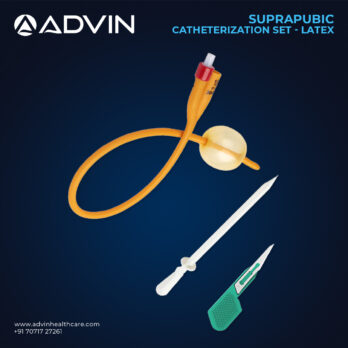 The Suprapubic Catheter Set 16FR by Advin Health Care is designed for patients requiring long-term or temporary bladder drainage. Made from high-quality biocompatible silicone or PVC, it ensures smooth insertion and maximum patient comfort. The 16FR size allows efficient urine flow while minimizing trauma during placement. Each sterile set includes the catheter, introducer needle, guidewire, dilator, and collection accessories, providing a complete solution for safe and effective use. Its design reduces the risk of urethral complications and is suitable for both hospital and home care settings.