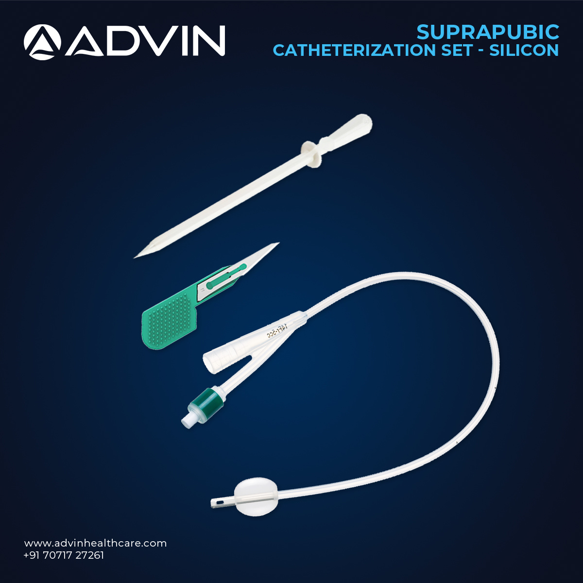 The Suprapubic Catheter Set 16FR by Advin Health Care is designed for patients requiring long-term or temporary bladder drainage. Made from high-quality biocompatible silicone or PVC, it ensures smooth insertion and maximum patient comfort. The 16FR size allows efficient urine flow while minimizing trauma during placement. Each sterile set includes the catheter, introducer needle, guidewire, dilator, and collection accessories, providing a complete solution for safe and effective use. Its design reduces the risk of urethral complications and is suitable for both hospital and home care settings.
